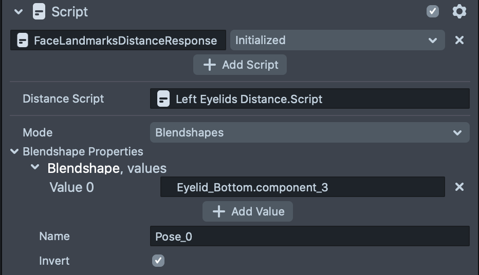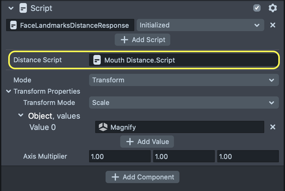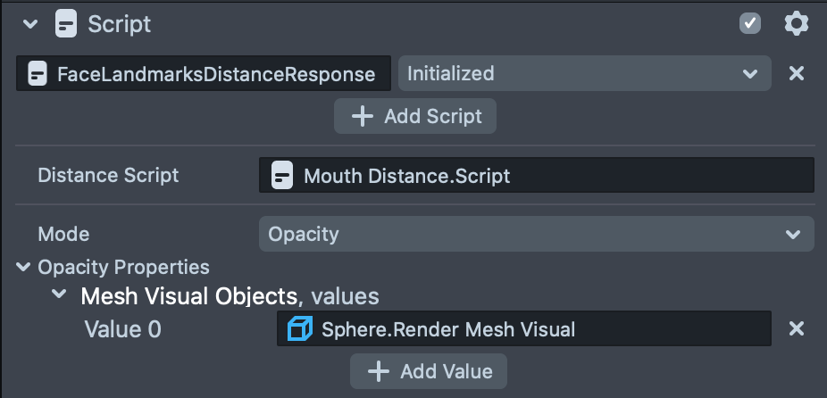The sections below walk through each customizable setting in the FaceLandmarksDistanceResponse script.