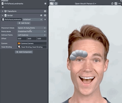 To attach your objects to Landmarks, just place any content as a child of the PinToFaceLandmarks script in the Objects panel.