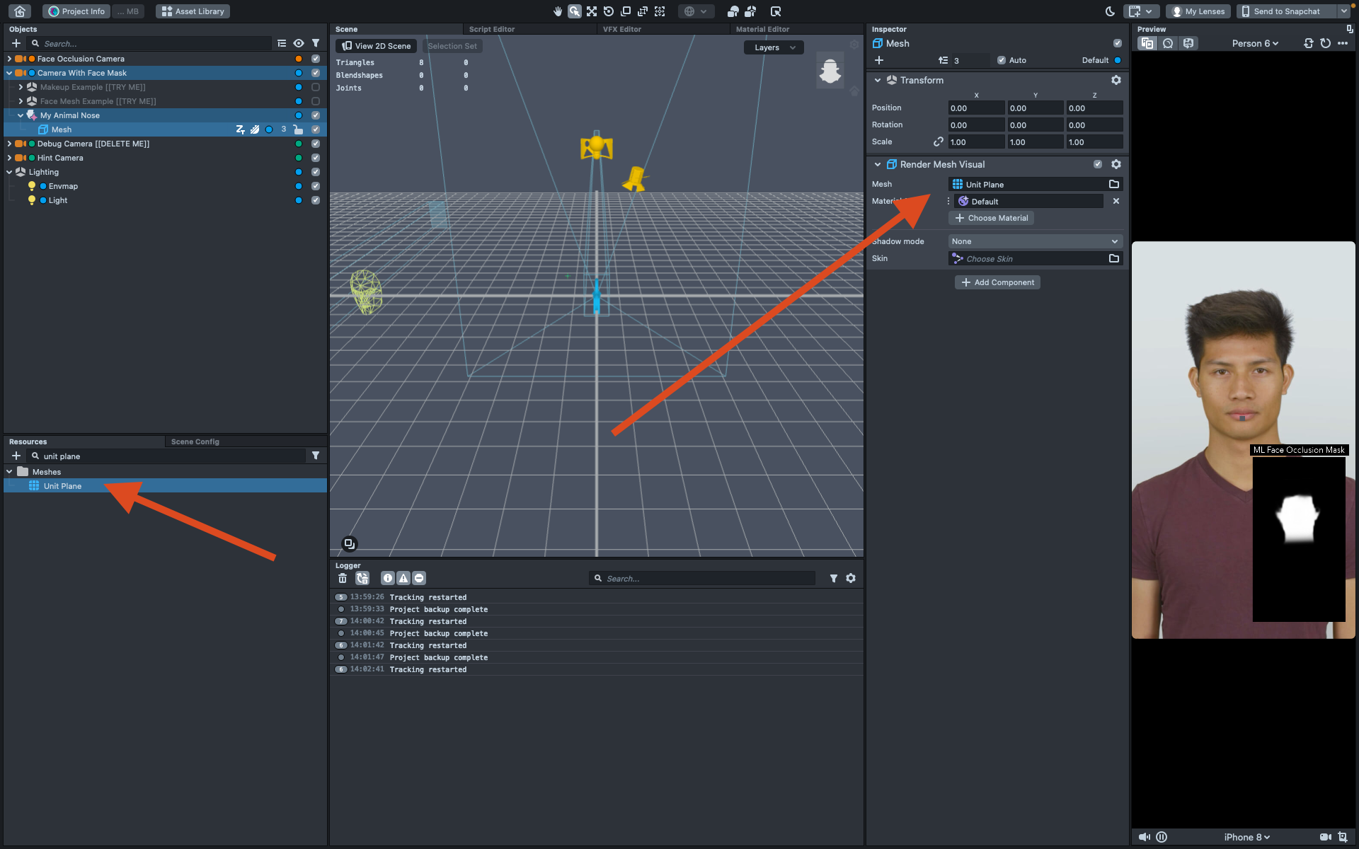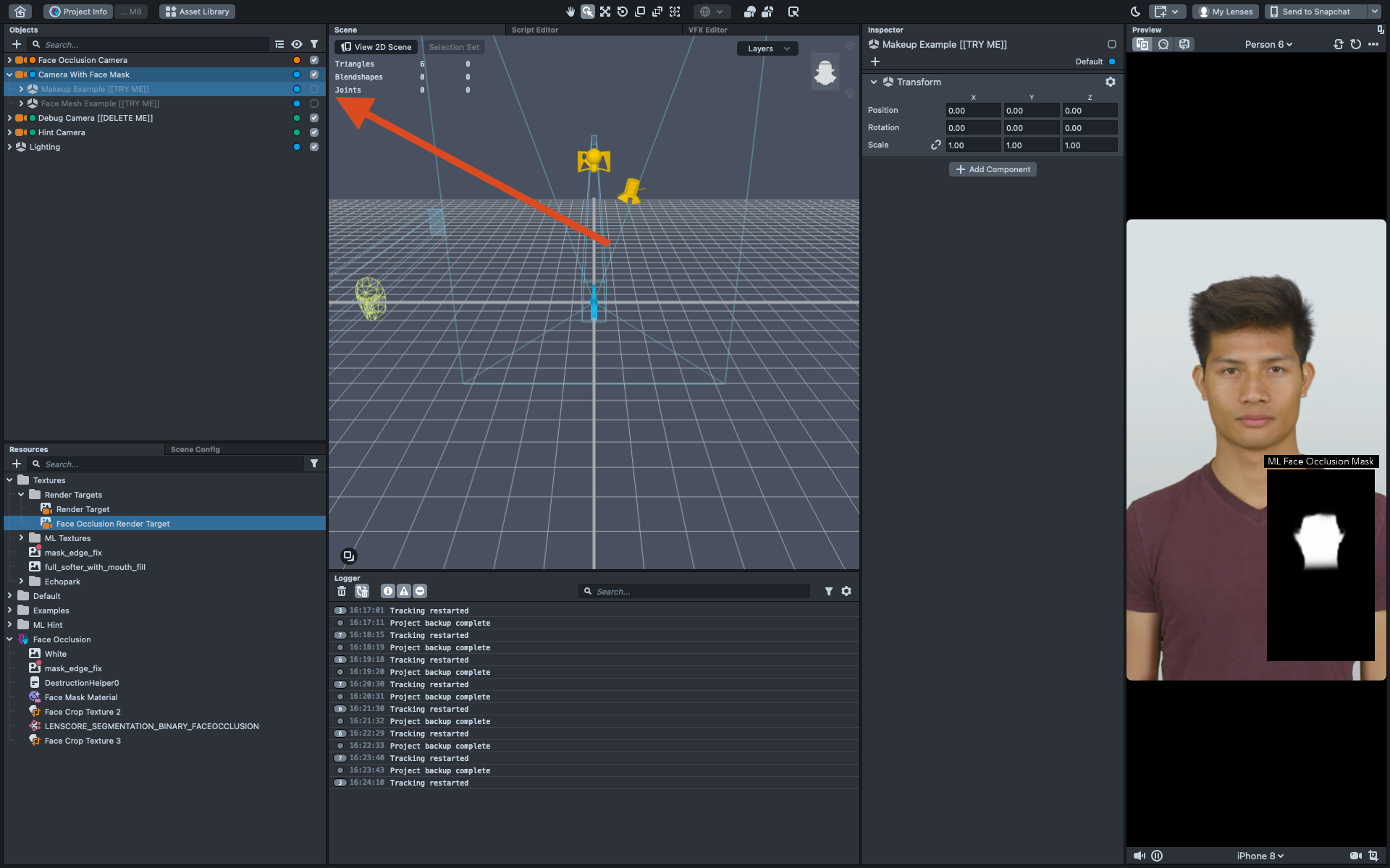 In the Template, the Objects Panel has multiple examples that demonstrate how to use both the Face Segmentation and Face Occlusion Custom Components. Additionally, there is a debug view that shows what the output of each Custom Components.