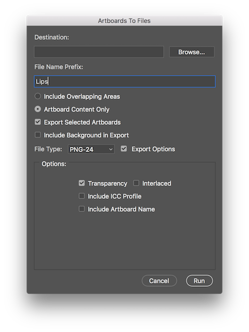 In the Artboard to Files options, choose PNG as the file type if you have transparency, or JPEG if you don’t. Make sure to have Artboard Content Only and Export Selected Artboards checked.