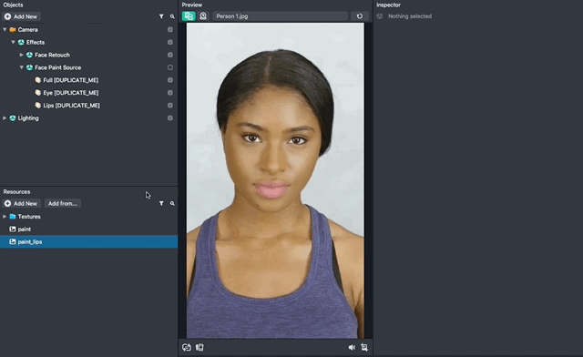 With your texture imported, find the Face Paint Template Source object in the Objects panel. Underneath are multiple Face Mask effect objects that correspond to the available Artboards in the Photoshop template (Eye, Lips and Full). Duplicate the one that corresponds to the texture you created by selecting it in the Objects panel, right clicking and selecting Duplicate. Next, select your new object and in the Inspector panel, set the Texture field to your imported texture.
