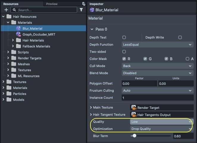 The blur material adjusts the blurriness/smoothness of our hairstyle. We can also adjust its quality for further optimization. Be aware lower quality might cause some hairstyles to look less smooth.