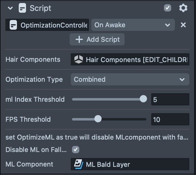 In the OptimizationController script, the ML Bald Layer will be toggled based on FPS and mlPerformanceIndex of the device, check out the section about Optimization below to learn more!