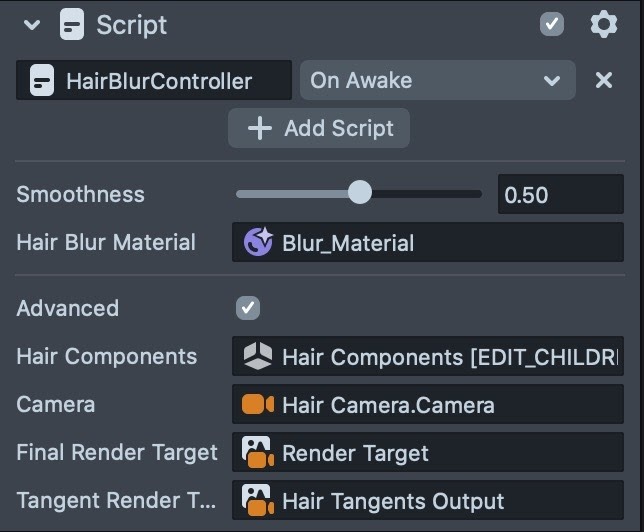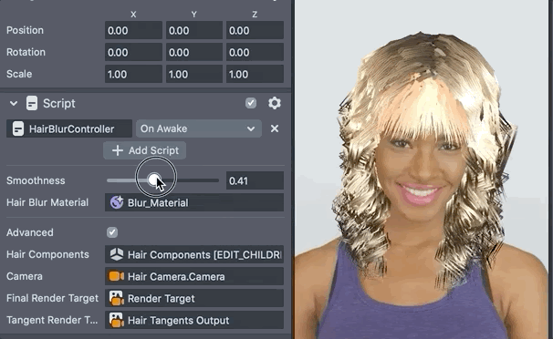 The HairBlurController script is crucial for simulating smooth looking hairstyles. Most of these hairstyles would not look nearly as good without the HairBlurController script.