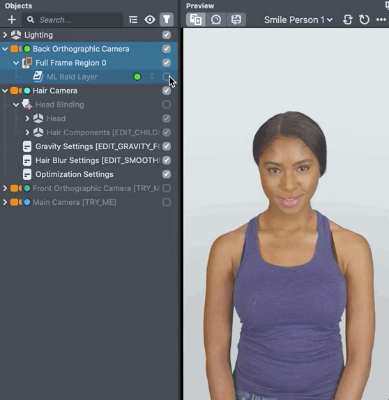 The Back Orthographic Camera in the template contains the ML bald model, it is used to block off existing hair from users, creating a smooth look when combined with the hair component.