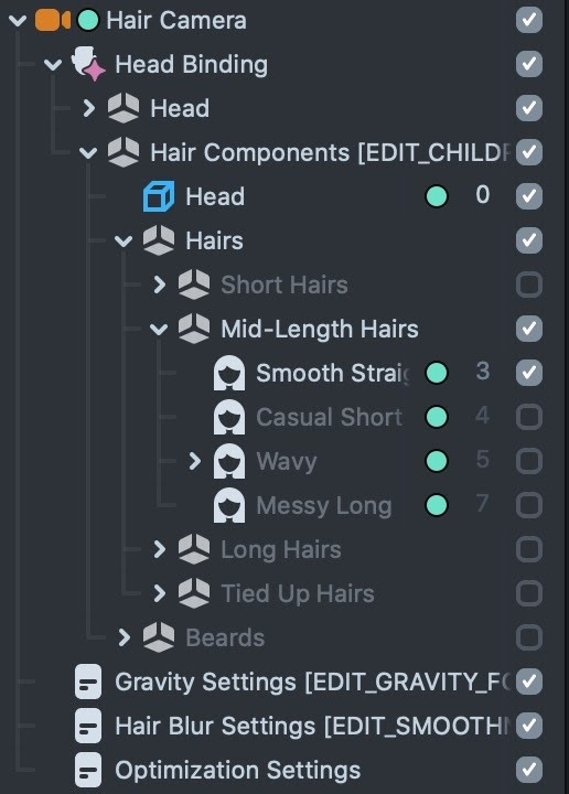 Everything related to hair simulation is placed under the Hair Camera with according layer. In here you’ll find the Head object that contains head and neck occluders and colliders, the Hairs object which contains all hairstyles, the Beards object which contains a few simulated beards, and all the main settings scripts.