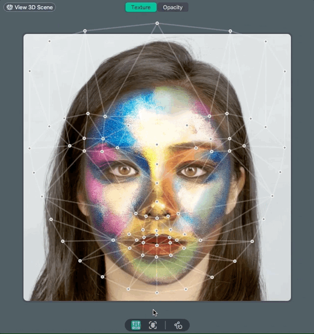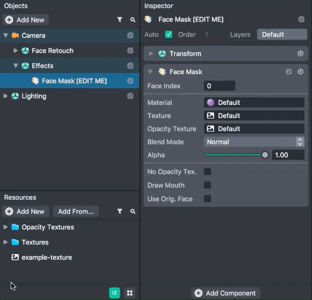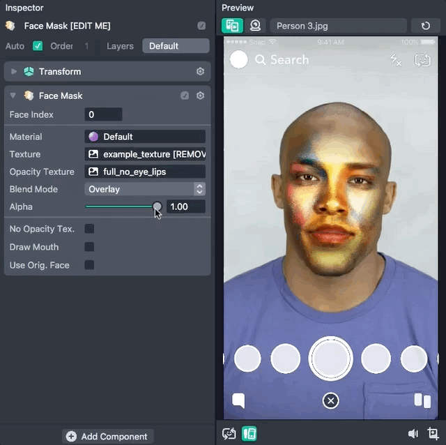 You can also modify an image’s opacity by moving the Alpha slider in the Face Mask component in the Inspector panel.