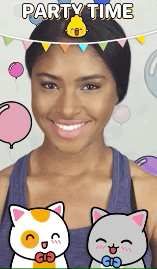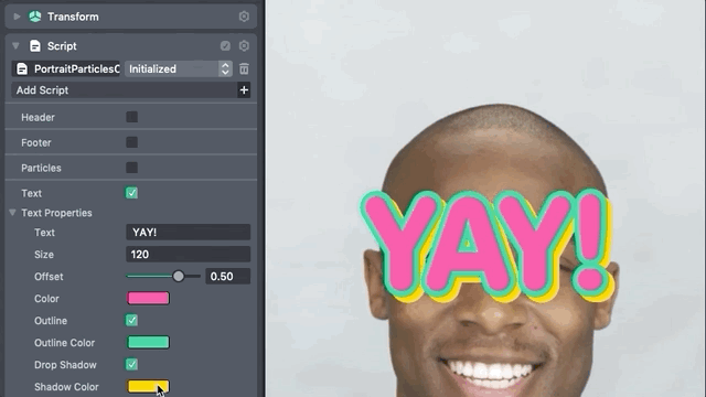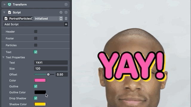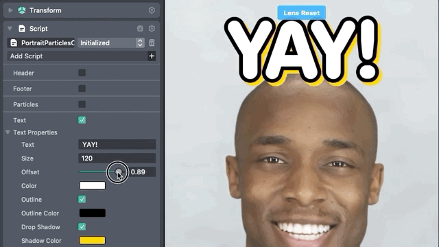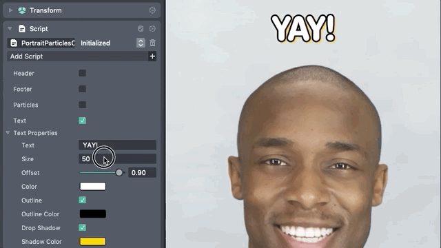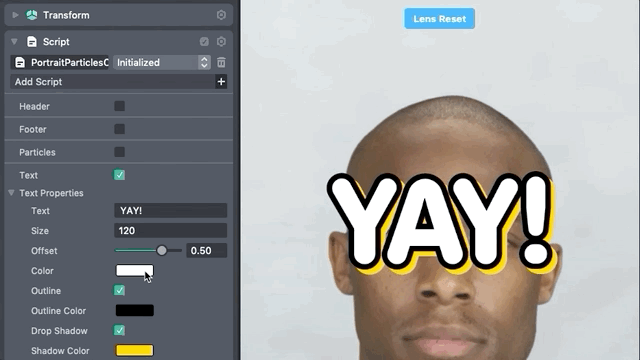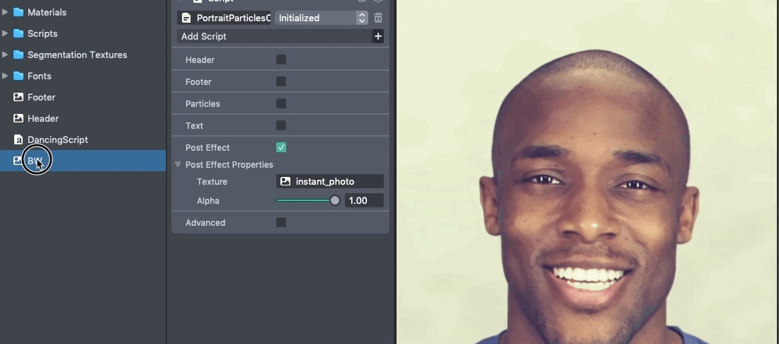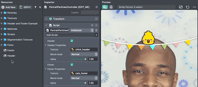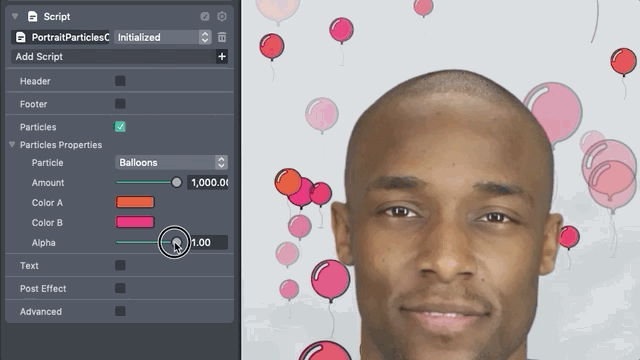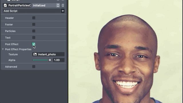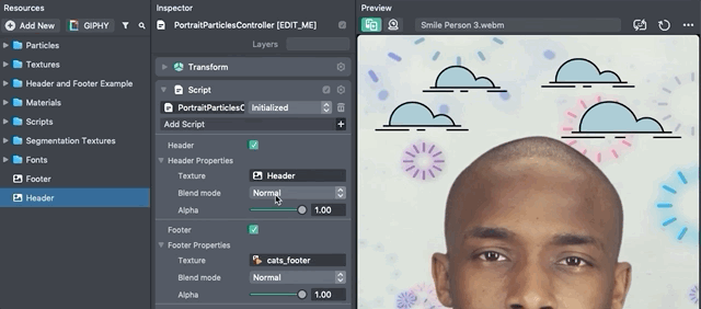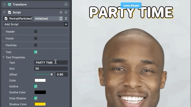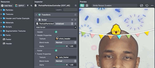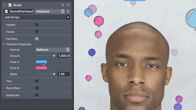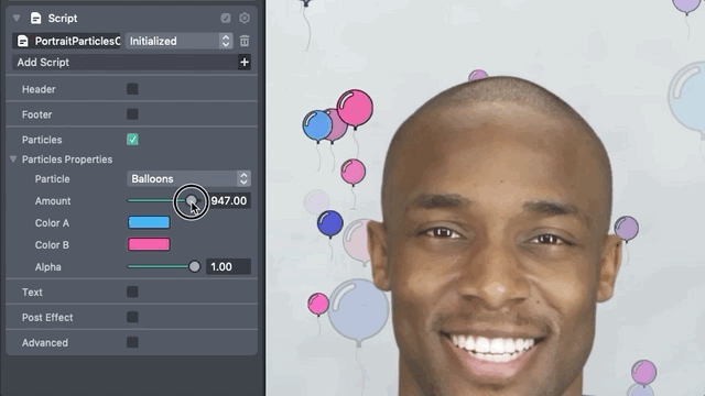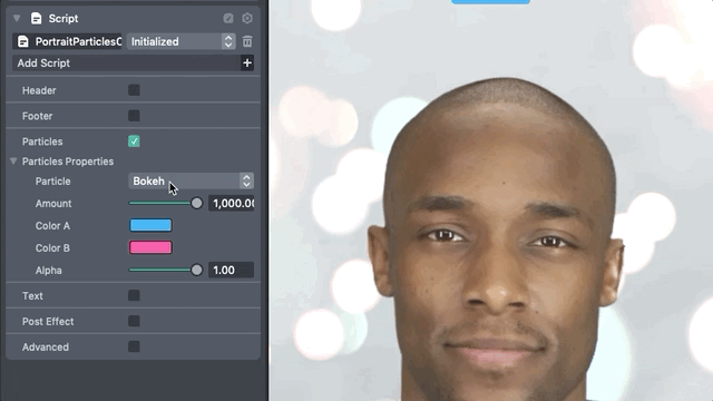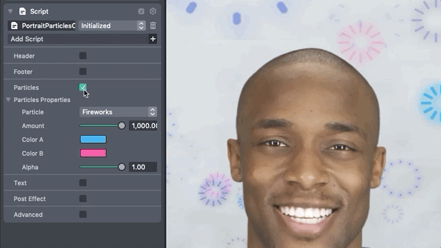 The Portrait Particles Template allows you to create a fun and simple face Lens for a party or event. The template features multiple particle presets that you can add behind the user. For further customization, you can also use your own particles, add a custom message, add a header and footer images, as well as add post effect to add a color filter to your Lens.