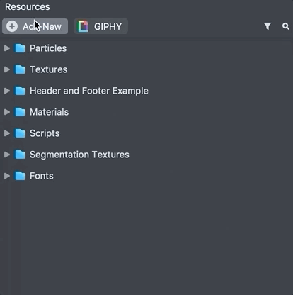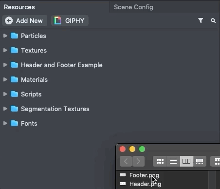 To replace the header or footer with your own image, you can import an image or 2D animation from your computer into the Resources panel. Select the image (PNG, JPG, or GIF), then drag and drop it into the Resources panel.