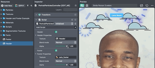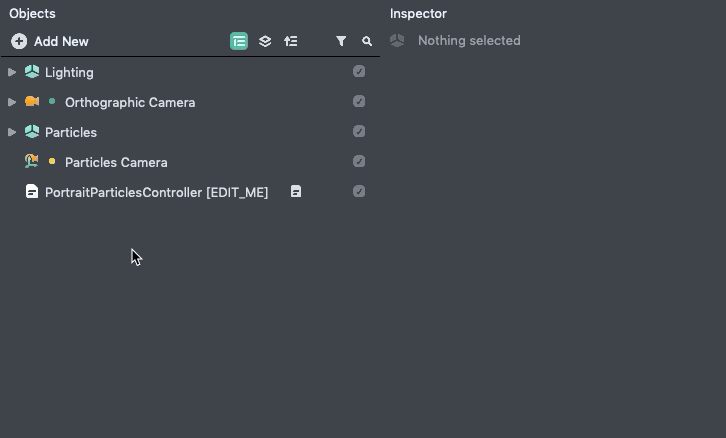 To get started, select the PortraitParticlesController [EDIT_ME] in the Objects panel. You can adjust its settings in the Inspector panel to customize your Lens.