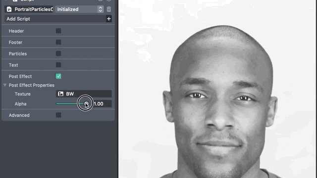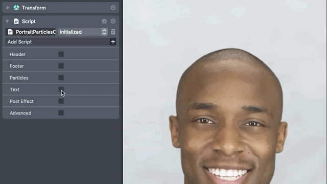 The Portrait Particles template also allows you to add color correction to your Lens using a color look up table. You can enable or disable this feature by toggling the Post Effects checkbox.