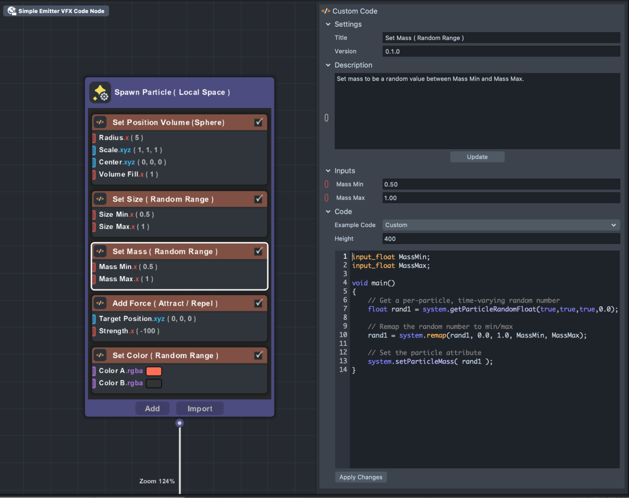 Code Nodes can also be used in VFX Editor. For VFX graphs, the free-floating Code Node is available from Material Editor, as well as special versions that can be added to each particle execution stage.