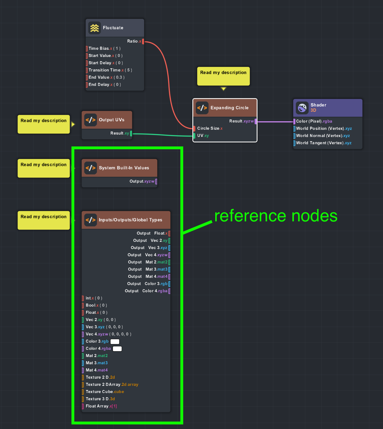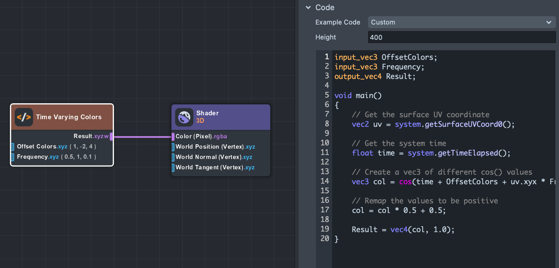 Output UV’s simply gets the first UV coordinate and assigns it to the Result output wire. Clicking on this node, you can see it is using the system.getSurfaceUVCoord0() function. The system command accesses built-in uniforms and functions.