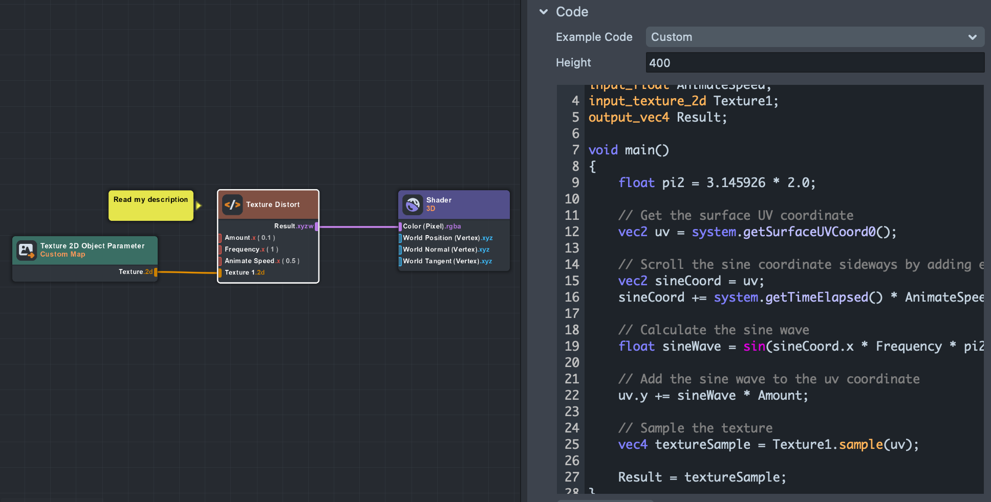 This example not only samples a texture, but also distorts the texture's UVs first to create a wavy texture animation.