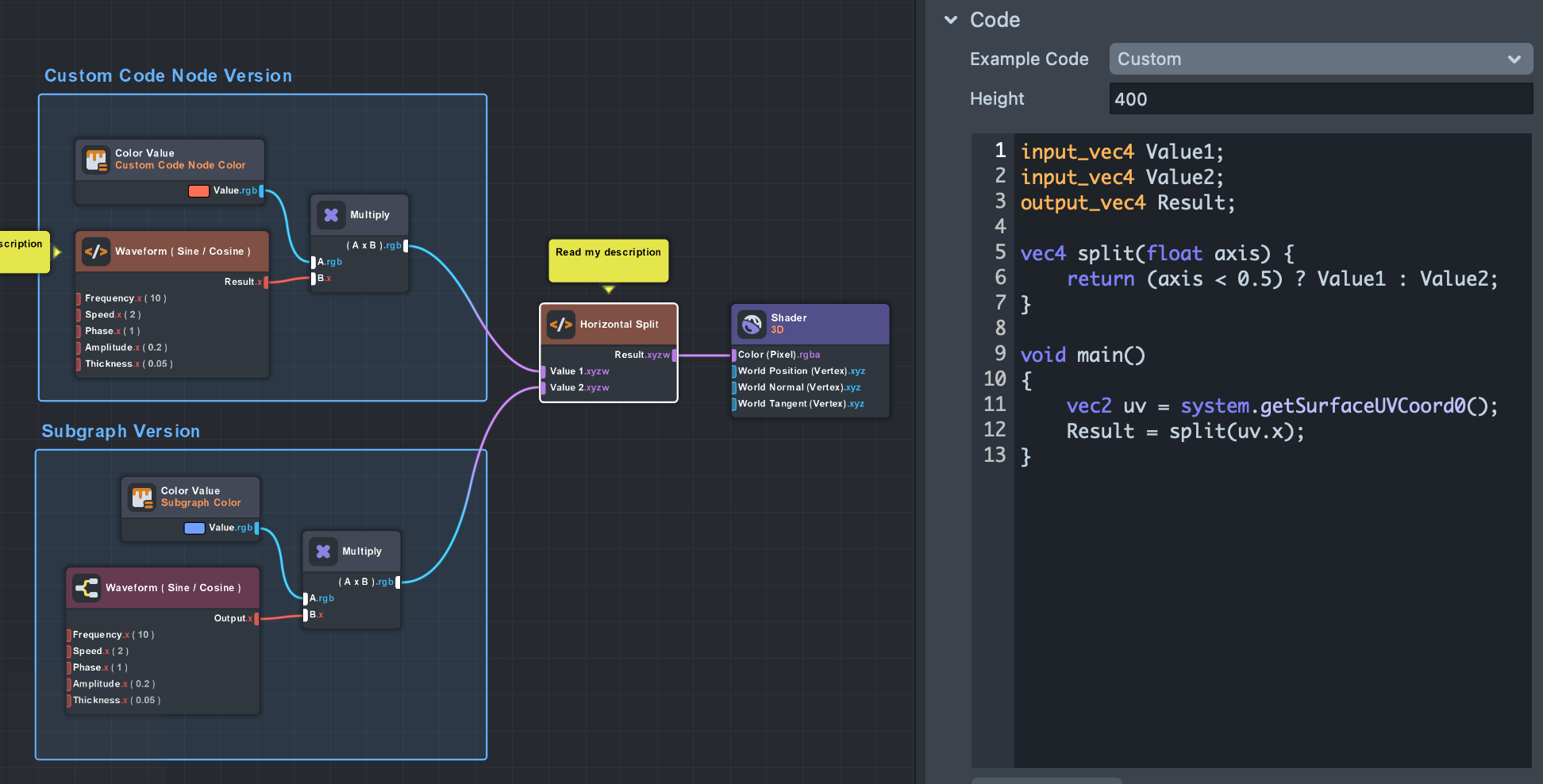 These three materials demonstrate what it looks like to transcribe a subgraph to Code Nodes. Code Nodes are similar to subgraphs in that they encapsulate portions of the graph to a single node, and have their own user-defined inputs and outputs.