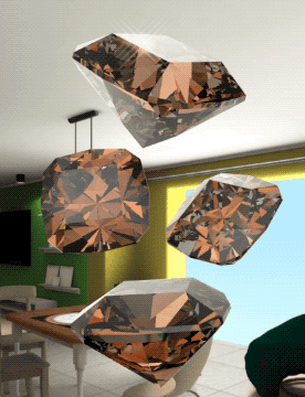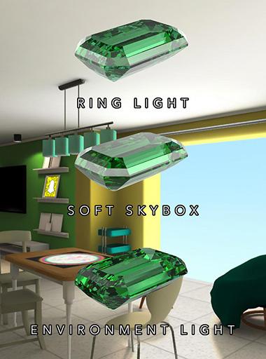 Gem Materials can be configured to use three different light types: Ring Light, Soft Skybox, and Environment Light. This example shows the same gem mesh with the same material applied to it, the only difference being the lighting type.