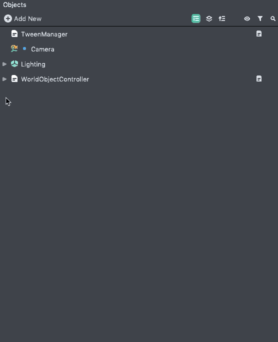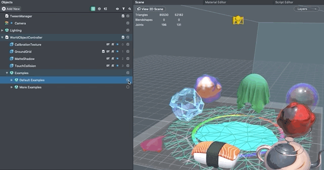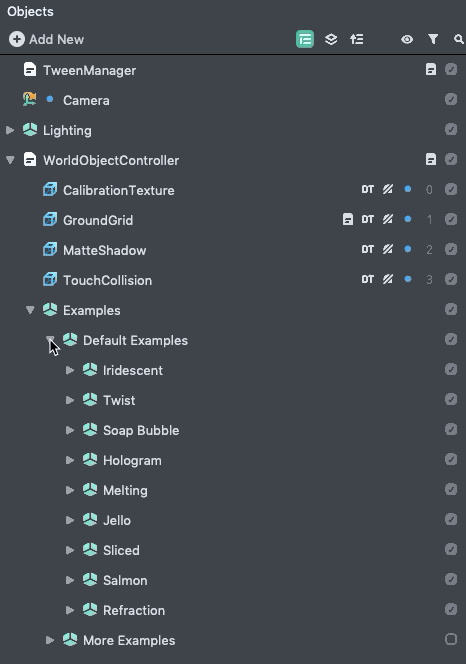 To see the other example you can simply disable the Default Example object and enable the More Example scene object by pressing the checkbox next to the object’s name in the Objects panel.