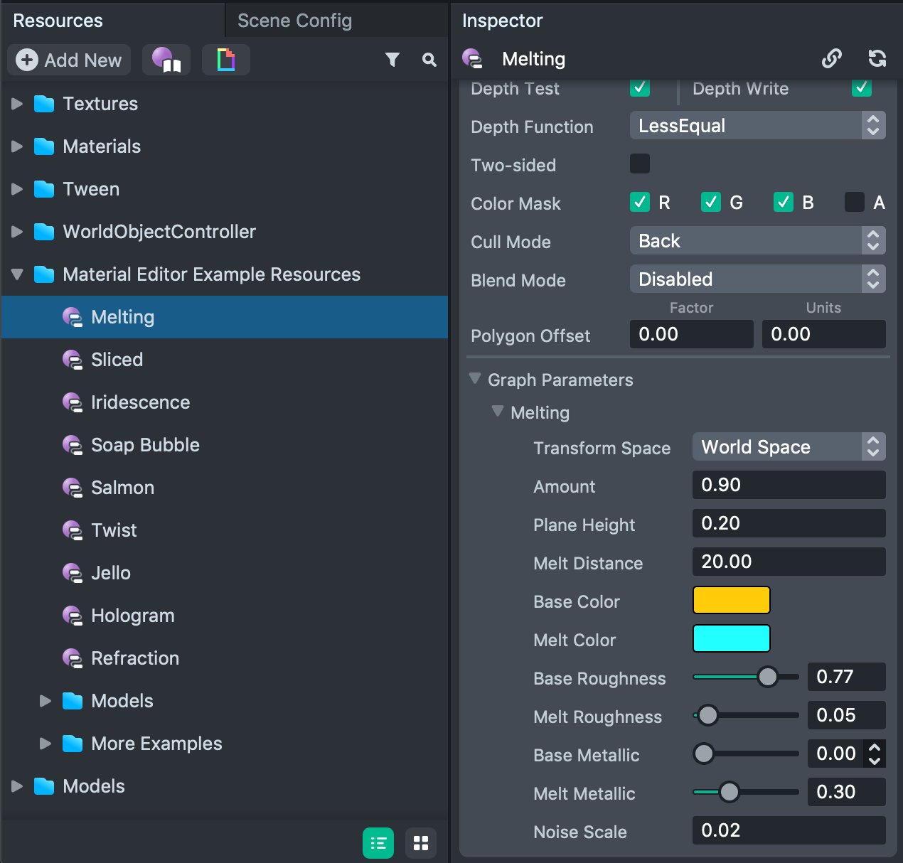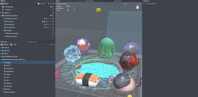 Each material has options that you can easily tweak. To modify a material’s setting, select the material in the Resources panel, then in the Inspector panel, you should see several parameters specific to that material you can modify.