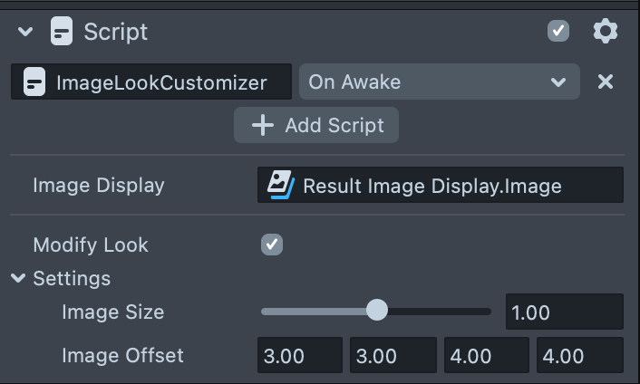 Similarly, the Result Image Display is modified by the Image Look Customizer which has Result Image Display as a reference in the Image Display field. For example, you might shift the position of the image by changing the numbers next to Image Offset (in order, the number represents: left, right, bottom, top).