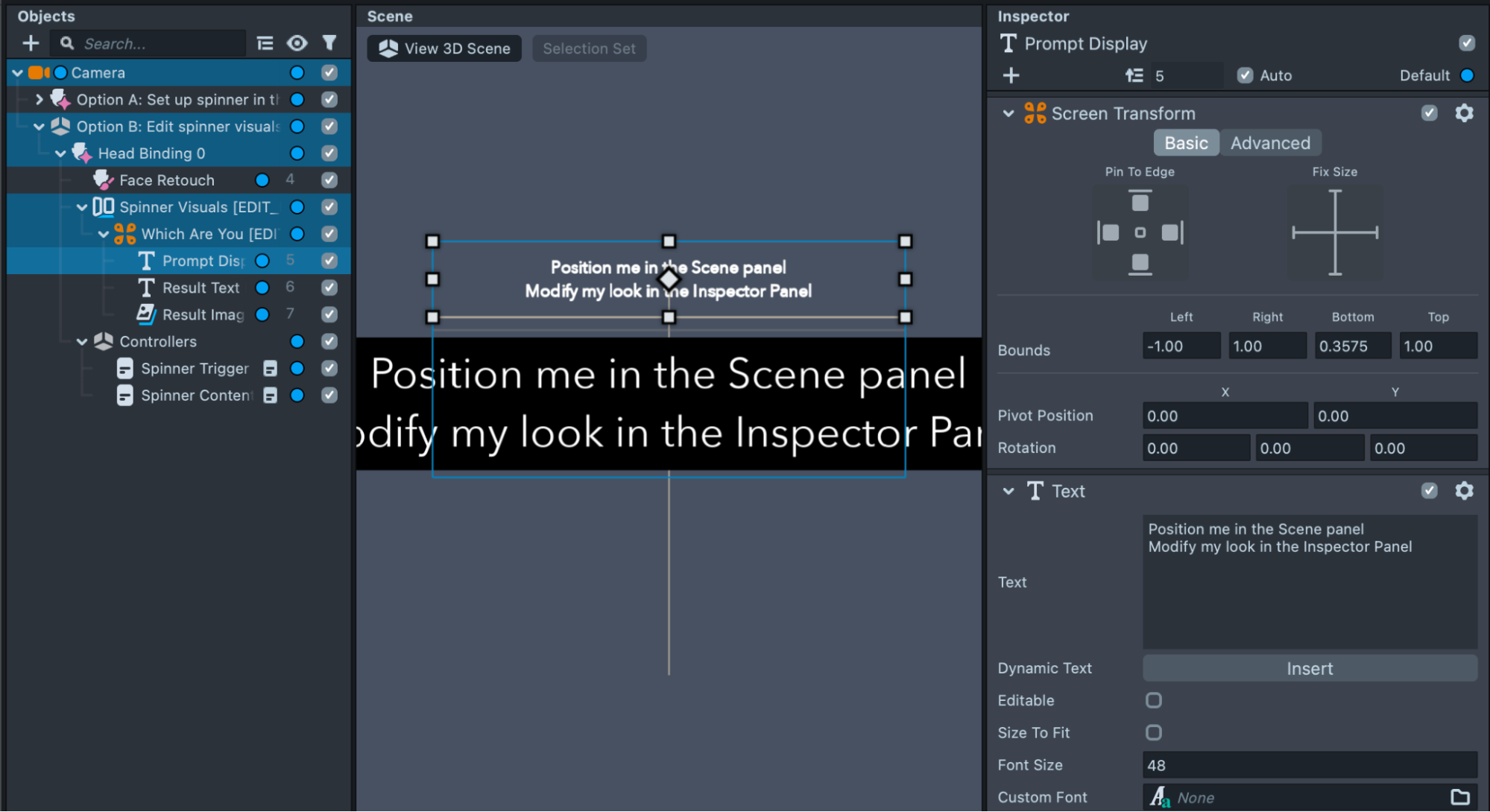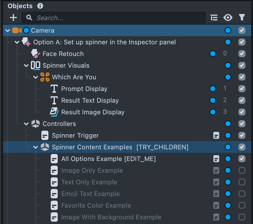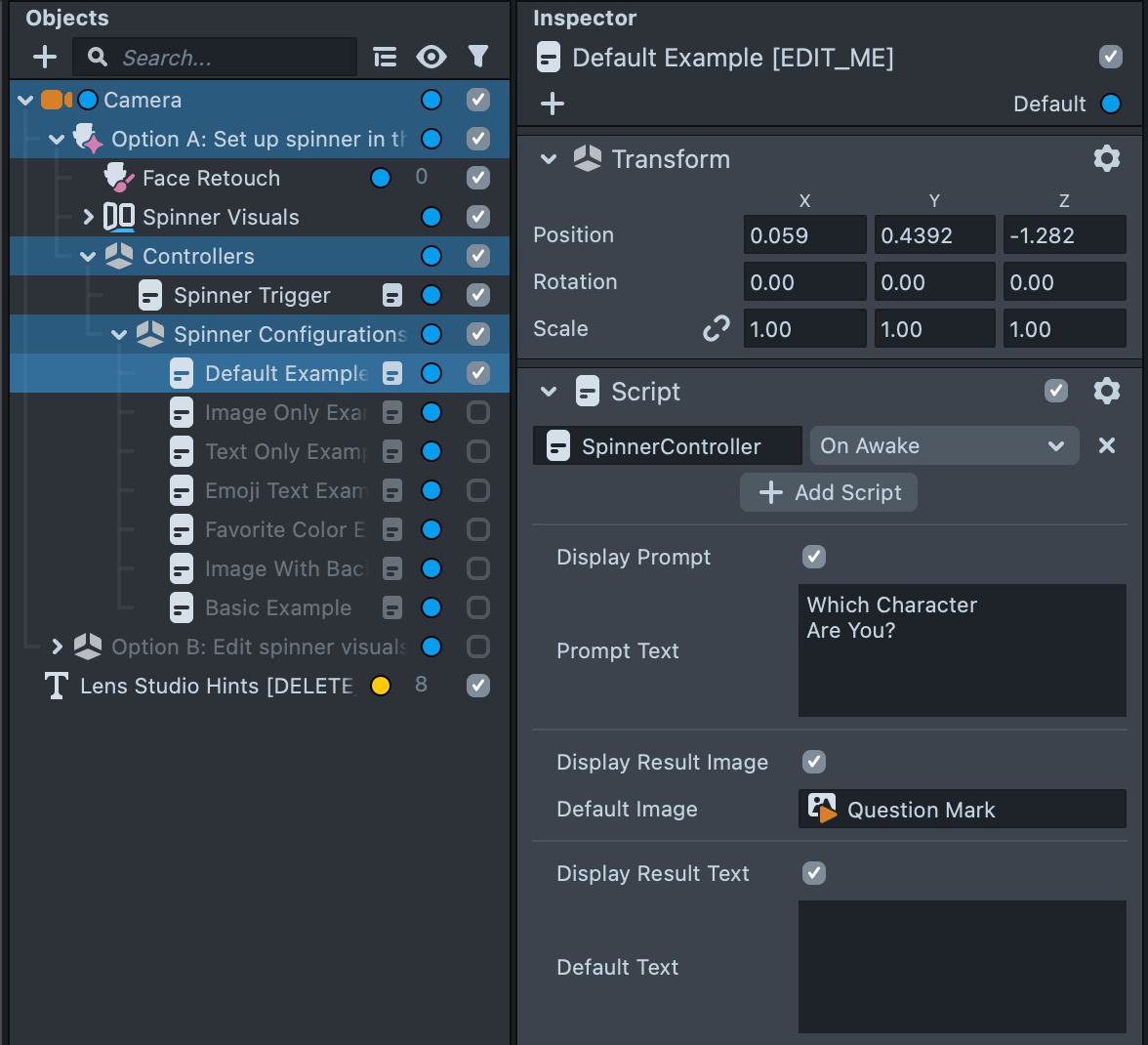To configure your spinner, select the Spinner Content object in the Objects panel, which contains the Spinner Controller. In the Inspector panel, you can change what your spinner displays.