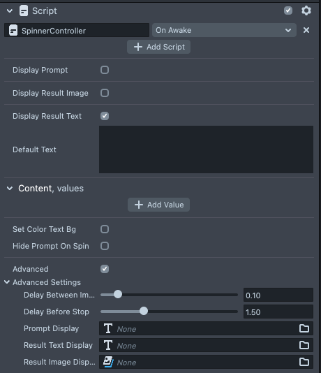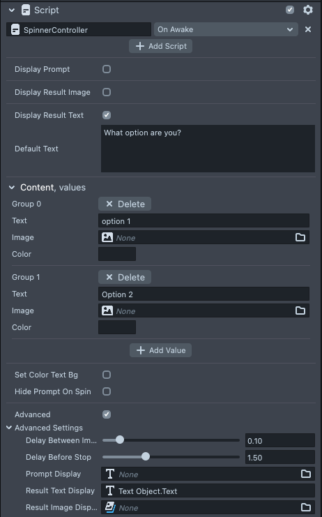 Result Text's background color based on an option'sColorfield. - Hide Prompt on Spin allows you to hide the prompt when an option is being presented to allow the user to focus on the result.