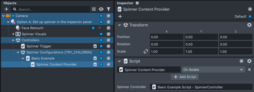 To add the Spinner Controller script to an object: Create a new object by going to the Objects panel > + > Scene Object. With the new object selected, in the Inspector panel, press + Add Component, Script. Finally, press + Add Script, and choose the Spinner Controller in the popup.