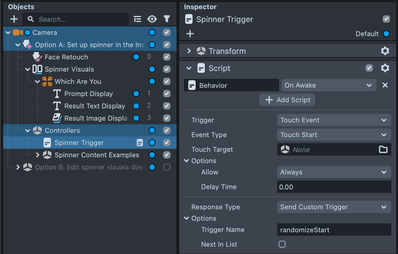Notice how there are two Behavior scripts. One for the tap event, the other for the mouth event. They both Send Custom Trigger to randomizeStart, which is actually what calls the Spinner Controller. You can add more triggers by adding another Script component and using the Behavior script.