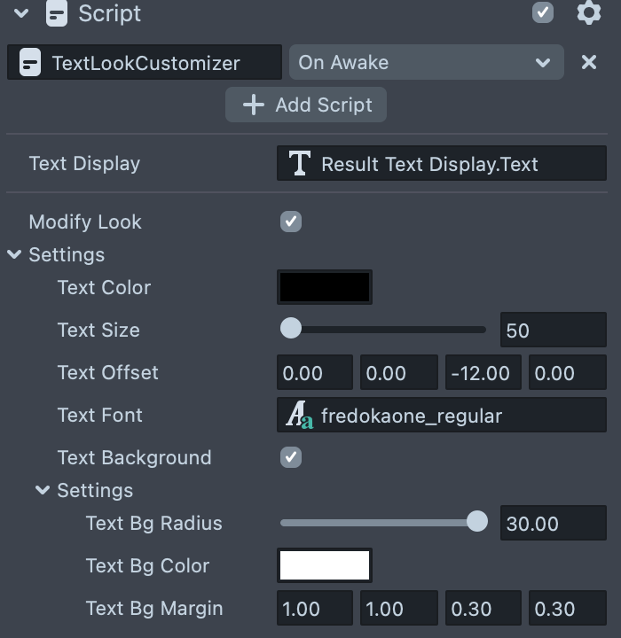 For example: If you are using the Set Color Text BG option in the Spinner Controller, you can define how the background looks by toggling Text Background then changing Text Bg Radius and Text Bg Margin, for the Text Look Customizer with a reference to Result Text Display.
