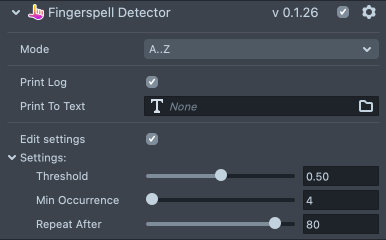 Let's take a look at the Fingerspell Detector Custom Component API: