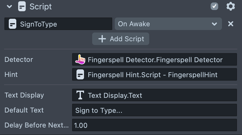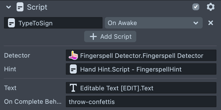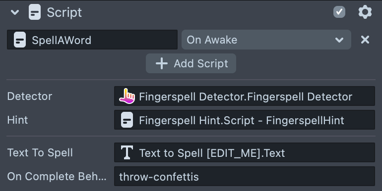 The template comes with four examples to demonstrate how you can use the Fingerspell Detector to create an interactive experience. Take a closer look at the scripts in the Scripts/Examples folder for more information.