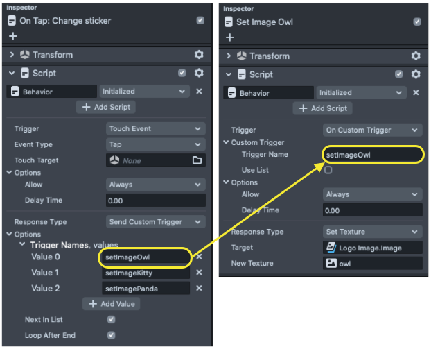 The response for each Custom Trigger is set in the child objects. In each child object you can see two behavior scripts (similar to the previous example)--both responding to the same custom trigger listed in On Tap: Change Sticker Object. One changes the texture of the logo, and the other animates the logo using tween.
