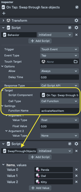 For example, in the On Tap: Swap through face objects, we wrote a script that enables only one object in a list, and disables everything else. Then, we exposed this function through the api property. Finally, we called this script using Behavior by using the name of that function.