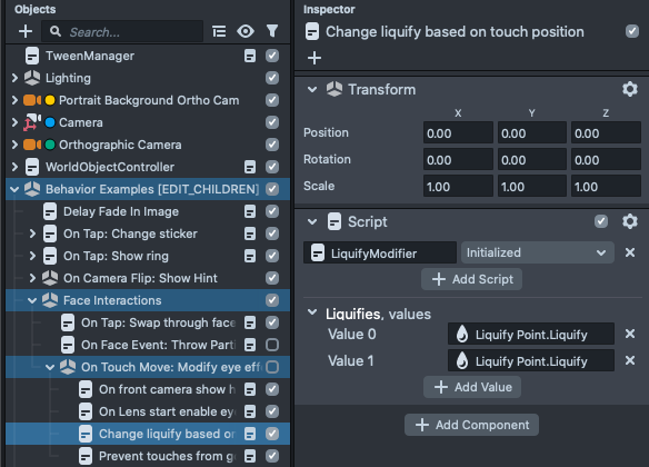Change liquify based on touch position: This is our actual interactivity logic--in this case it’s not connected to Behavior at all!Prevent touches from going beyond Lens: Since the interactivity we’ve defined ask the user to touch the screen, we might want to disable some of the default behavior Snapchat has when the user touches the screen so that two things are not happening at the same time
