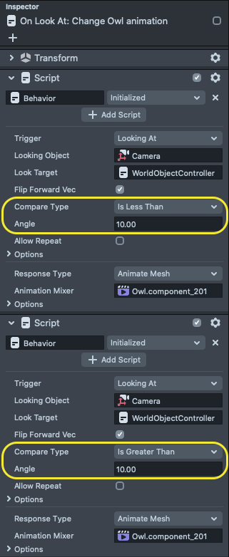 Demonstrates the usage of two behavior scripts to modify the animation of a 3D object--the first when a user is looking at, and the second when the user is not looking at an object.