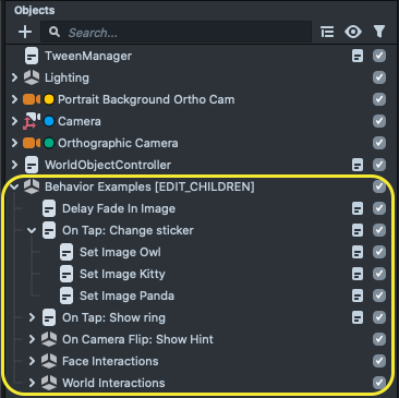 Each object under Face Interactions is an example of how you can connect your own script with Behavior. This is useful as Behavior can take care of some of the common Lens Studio specific code, while you can focus on the specific logic of the interactivity you want.