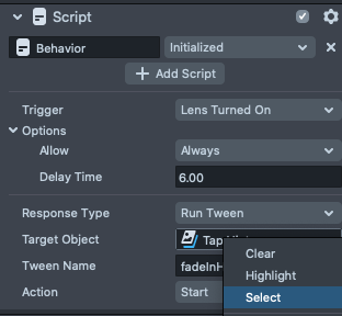 Lens Studio will automatically choose the referenced object. We'll input an object with Tween Script attached into the Target Object slot. Make sure the Tween Script on the target object has the same name as the Tween Name in this Behavior script.
