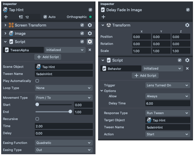In the first example, the hint is faded in using the Tween system. When working with Behavior or other components with references, a quick way to see how it works is to right click a field with a reference and choose Select in the popup menu. For example, right click the Target Object field containing Tap Hint, and choose Select.