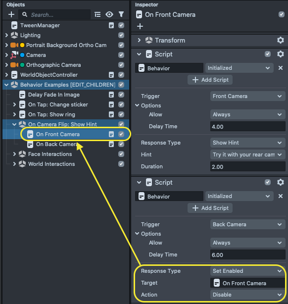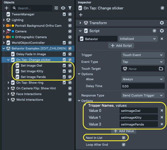 - Behavior: Use a drop down to choose different triggers, like screen touches and face event, to call responses like enabling/disabling objects, play animation, and more