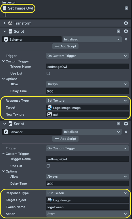 It is important, however, that if you were to respond to a Custom Trigger in your own script, that the Behavior script itself is above your custom script in the Objects panel (as the Behavior sets up the Custom Trigger system).