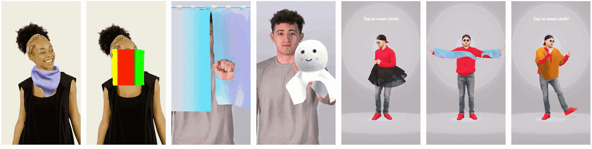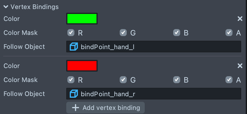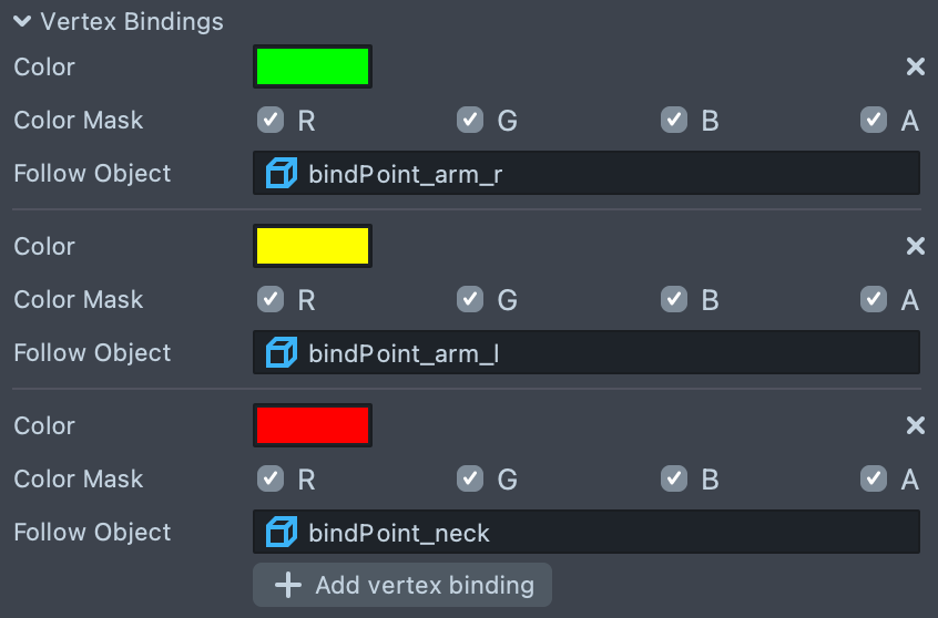 You can also bind multiple vertex colors to different Follow Objects. Lens Studio allows a single cloth mesh to bind to a maximum of 12 objects. See the Ribbon and Jacket examples for more information.