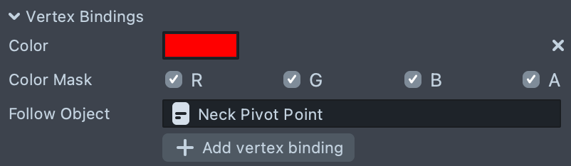 Here, bind red vertices in the mesh to the Follow Object. With different vertex colors, you can bind vertices to pivot points in Lens Studio. The bind parts won’t be affected by cloth simulation, but are stationary relative to pivot points. For example, you can bind the red part of the mesh bandana to the Neck Pivot Point object. Thus, the red part of the bandana remains relatively static to the Neck and the black part will have the cloth simulation effect.