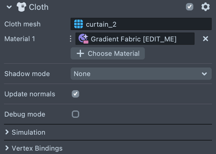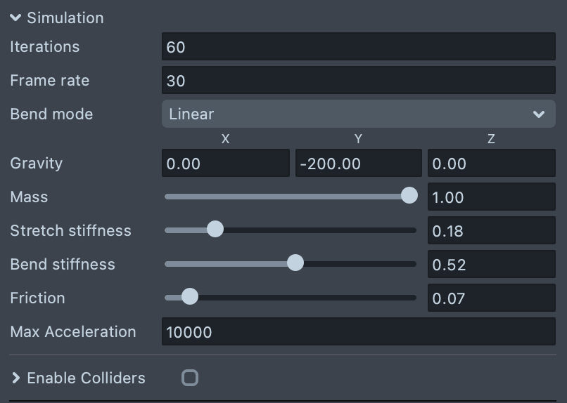 The Simulation Settings for the bandana are shown below. Try playing around with them to see how they work.