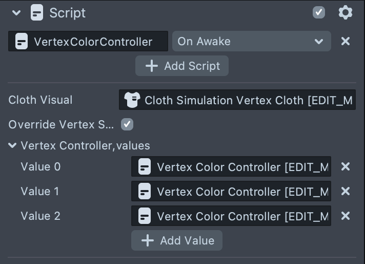 Now that you understand Cloth Simulation at a high level, the next example shows you how to make a more complicated clothing item with the Vertex Controller. Enable the Vertex Color example in the Objects panel and select the Cloth Simulation object to see the VertexColorController Script Component after the Cloth Component.