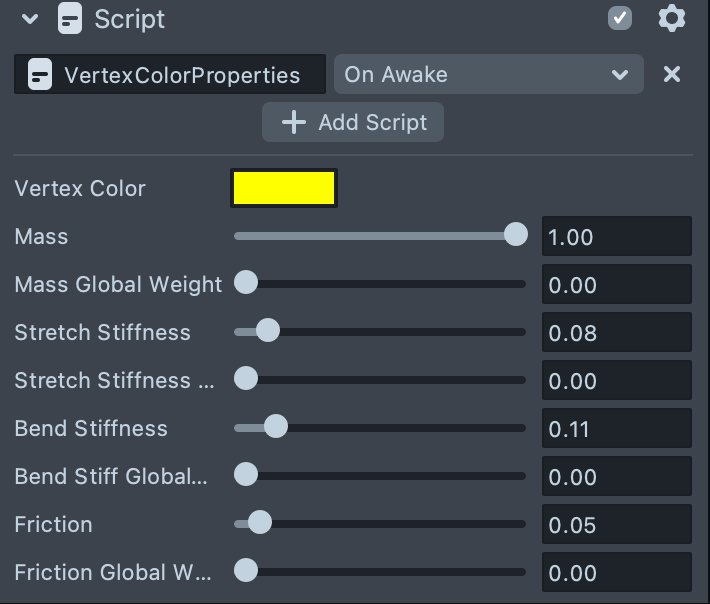 For each vertex simulation property, you have the global weight property. Global Weight is how much the global settings influence the Cloth Simulation script. Set Global Weight to 0.0 the absolute value of the property in the Vertex Controller on this vertex. Set Global Weight to 1.0 to ignore the property value in the Vertex Controller. When you disable the vertex controller, all vertex properties are 0.0 by default. The mesh is simulated by all global simulation settings.