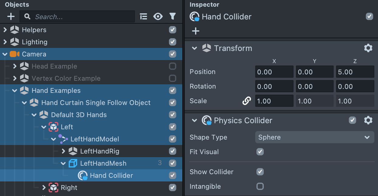 Expand the Left object to find the Hand Collider object. Click on the object to check the Physics Collider component in the Inspector panel. The right hand also uses the same setup.
