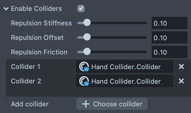 Enable the Enable Repulsion field and Use Colliders field and assign all the colliders to create the collision effect.