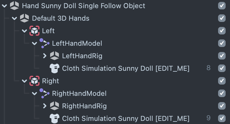 Hand Sunny Doll Example shows you how to attach the cloth to 3D hand tracking. Enable the Hand Sunny Doll Single Follow object in the Objects Panel. Instead of binding the cloth with a fixed pivot point in the Scene, the cloth is a child of the Left hand tracking object.