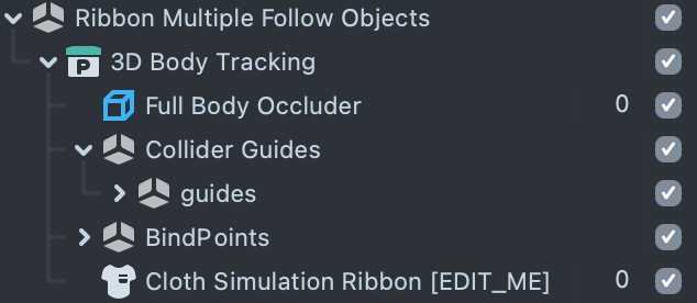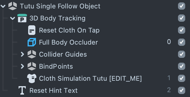 In this example, note that this 3D body tracking object has an Object Tracking component which has a mapping of the Collider Guides joint to the tracker’s.