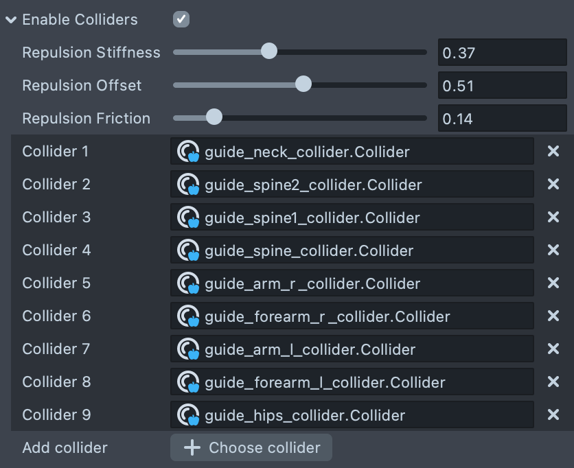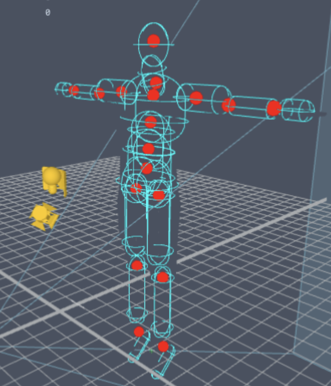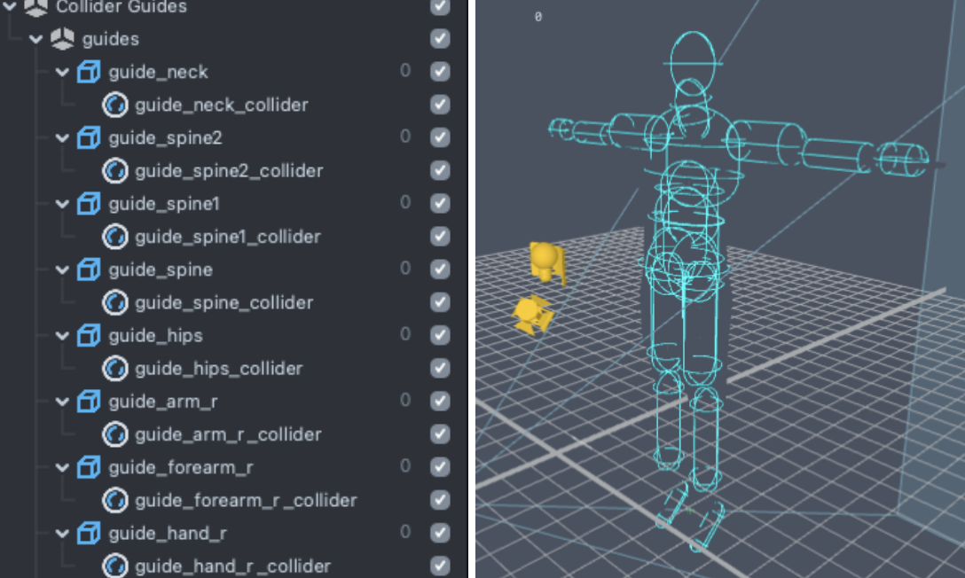 The Collider Guide object includes all collisions for body parts. Both the guides and collision are tracked to the body joints.