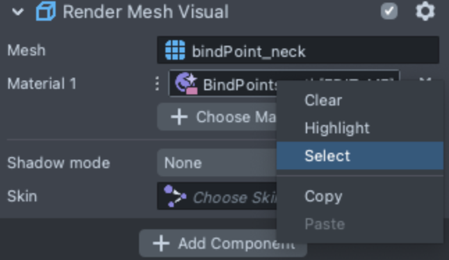 Click on any of the bind points. Note that the bind point is pinned to the collider guide. Now Select the bind point material.